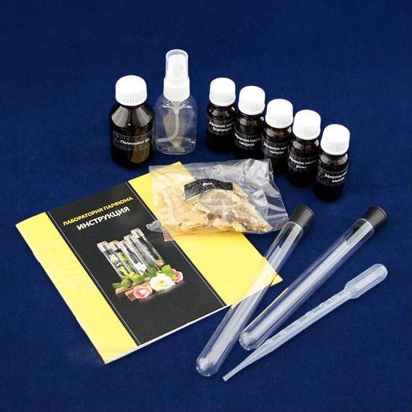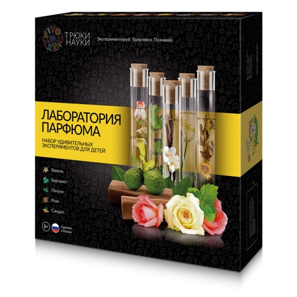 Набор химических экспериментов для детей, в который входят ингредиенты для многократного приготовления парфюмов на основе эфирных масел: "Бергамот", считается одним из самых востребованных в парфюмерии, благодаря способности сливаться со множеством других ароматов; "Ваниль", невероятно аппетитный, но в то же время чувственный и утонченный аромат; "Пачули", обладает богатым мускусно земляным ароматом с древесным оттенком, используется как базовая нота в парфюмах; "Роза", роскошный, обворожительный, невероятно женственный и нежный аромат, ноты которого присутствуют практически в любом цветочном парфюме. "Сандал", дающий древесный, смолистый, насыщенный аромат; не сильный, не кричащий, без резких нот, но очень стойкий.