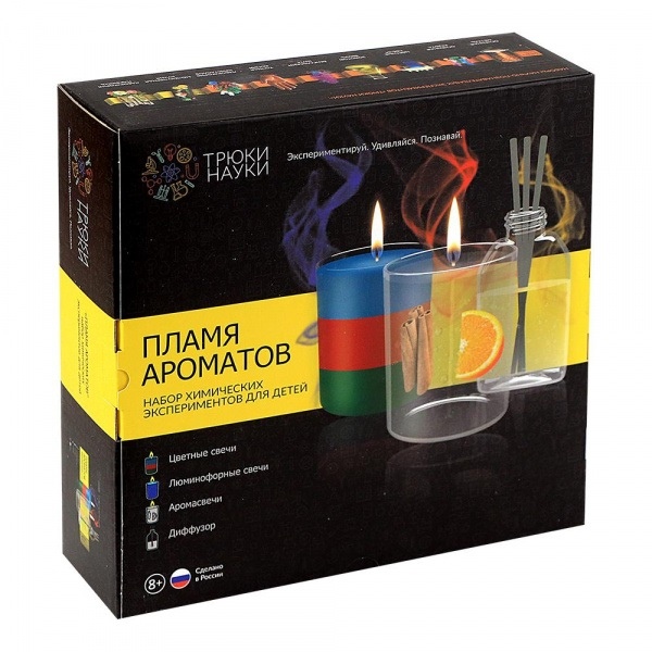 «Цветные свечи» Научитесь делать свечи своими руками. В данном наборе есть всё необходимое для изготовления парафиновых свечей. Также можно их разукрасить в синий, зелёный, красный цвета или сделать свой цвет при помощи смешения красителей, входящих в набор. «Люминофорные свечи» Сделайте свою уникальную свечу при помощи добавки фотолюминофора, которая позволит светиться свече в темноте даже без всякого огня! Удивите своих близких необычной красотой такой свечки. «Аромасвечи» Создайте свечи с новогодним настроением, добавив качественные эфирные масла апельсина и корицы, входящие в данный набор. «Диффузор» Наполните пространство вкусным ароматом при помощи диффузии. Приготовив раствор желаемой концентрации эфирных масел, вы сможете распространить его аромат при помощи специальных палочек.