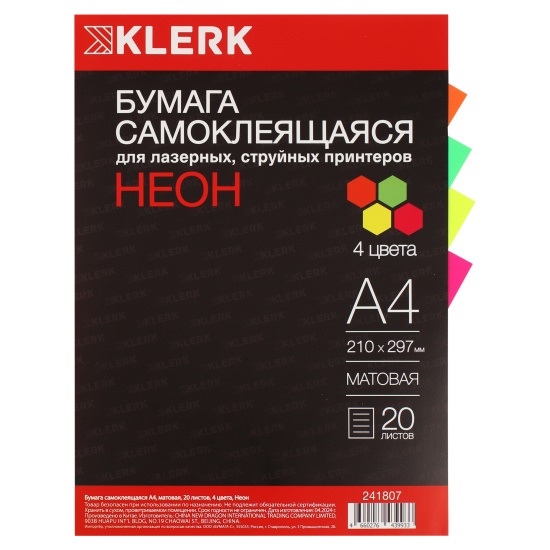 БУМАГА САМОКЛЕЯЩ УНИВ./А4/20Л НЕДЕЛЕНАЯ НЕОН 4 ЦВ KLERK 241807 (9933)