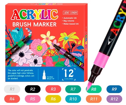 НАБОР МАРКЕРОВ АКРИЛ 12 ЦВ КИСТЬ 1-5 ММAW-1909/DN-18 (0180)