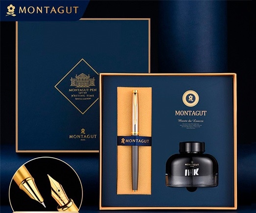 РУЧКА ПЕРЬЕВ MONTAGUT 0,5 ММ МЕТАЛЛ КОРПУС СЕРЕБРО/СЕРАЯ ПОРШНЕВАЯ+ ЧЕРНИЛА 30МЛ /ФУТЛЯР/ TJ-4(4206)