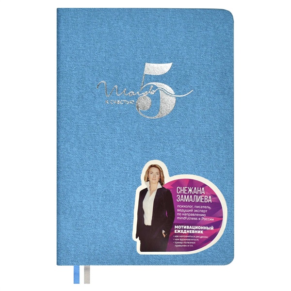 Ежедневник недатированный ESCALADA, 5 ШАГОВ К СЧАСТЬЮ, А5, 160 л., арт. 63971/ 15 ДЖИНС ГОЛУБОЙ (кожзам: 146х211 мм, твёрдый переплёт, материал обложки: искусственная кожа "Джинс"; способ крепления блока: ниткошвейный; декор: тиснение фольгой; вн. блок: 160 л., кремовый офсет 70 г/м², печать в две краски (линия), справочный материал: есть; перфорация углов блока: нет; отделка среза: фольгирование; закладка/-и: два ляссе, каптал: есть; форзац: печать пантоном, особенности: в блоке использованы авторские разработки на тему позитивного мышления, гармонии с собой и самоосознанности от преподавателя, спикера, ведущего эксперта по mindfulness-направлению в России – Снежаны Замалиевой; персонализация возможна: да; индивидуальная упаковка: промостикер + ПЭТ-пакет)