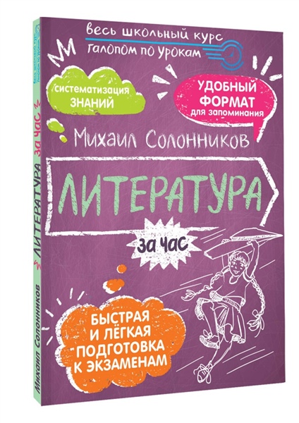 Это пособие станет незаменимым помощником для школьников 5–11 классов. В нём систематизирован школьный курс по литературе: историко-литературный процесс, разборы великих произведений, краткая информация о писателях и поэтах. Тщательно выверенная и представленная в виде инфографики информация позволит сэкономить время на поиск ответов в Интернете или в разных учебниках, активизирует ресурсы памяти, поможет быстро подготовиться к контрольной или экзаменам. Михаил Солонников — педагог по русскому языку и литературе, эксперт ЕГЭ и ОГЭ, победитель конкурса "Педагогические надежды", основатель и ведущий блога "Литература в школе". Для среднего и старшего школьного возраста.