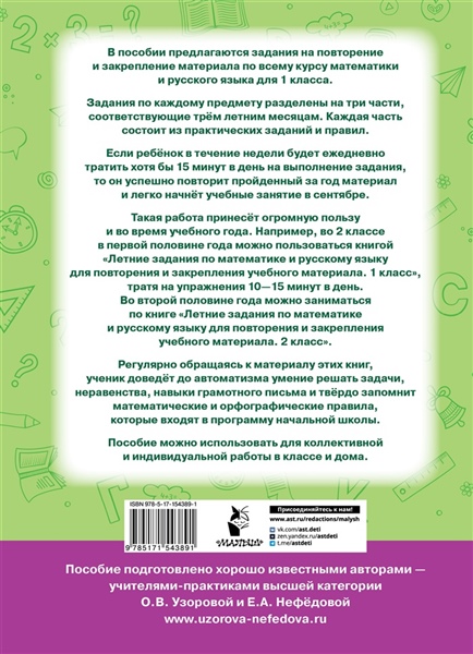 В пособии предлагаются задания на повторение и закрепление материала по всему курсу математики и русского языка для 1 класса.Задания по каждому предмету разделены на три части, соответствующие трём летним месяцам. Каждая часть состоит из практических заданий и правил.Если ребёнок в течение недели будет ежедневно тратить хотя бы 15 минут в день на выполнение задания, то он успешно повторит пройденный за год материал и легко начнёт учебные занятие в сентябре.Такая работа принесёт огромную пользу и во время учебного года. Например, во 2 классе в первой половине года можно пользоваться книгой "Летние задания по математике и русскому языку для повторения и закрепления учебного материала. 1 класс", тратя на упражнения 10—15 минут в день. Во второй половине года можно заниматься по книге "Летние задания по математике и русскому языку для повторения и закрепления учебного материала. 2 класс".Регулярно обращаясь к материалу этих книг, ученик доведёт до автоматизма умение решать задачи, неравенства, навыки грамотного письма и твёрдо запомнит математические и орфографические правила, которые входят в программу начальной школы.Пособие можно использовать для коллективной и индивидуальной работы в классе и дома.