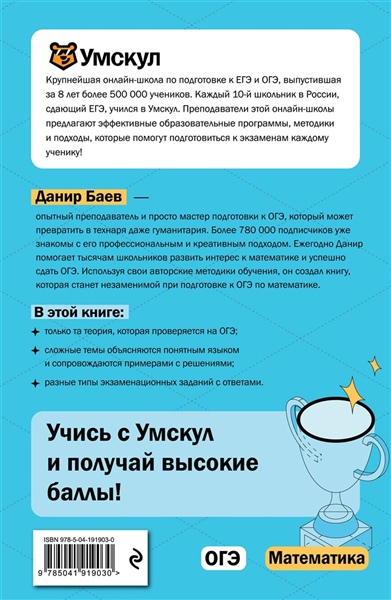 Эксклюзивный справочник от издательства «Эксмо» и топовой онлайн-школы «Умскул», выпустившей за 8 лет более 500 000 учеников, поможет каждому прийти к заветным баллам на ОГЭ 2025 по математике. В нём только самая актуальная и нужная для экзамена теория, а также разбор разных типов экзаменационных заданий! Автор пособия Данир Баев — опытный преподаватель, который может превратить в технаря даже гуманитария! В социальных сетях за ним следят более 780 000 подписчиков! Эта книга разложит по полочкам все темы по предмету за 5—9 классы: вы сможете запросто повторить уже изученный материал, а также проработать не охваченные ранее вопросы. Информация по разделам «Корни, степени, формулы сокращённого умножения», «Неравенства. Логические утверждения», «Уравнения», «Решение текстовых задач», «Теория вероятностей», «Арифметическая и геометрическая прогрессии», «Графики», «Окружность», «Площади фигур. Треугольники» и «Четырёхугольники» преподносится наглядно и понятно, а также сопровождается примерами. Вместе с теорией приводятся разные типы экзаменационных заданий с подробными решениями. Так ни одна важная мысль не ускользнёт от вас во время занятий! Присоединяйся к числу счастливчиков, с лёгкостью преодолевших экзамен благодаря «Умскул»!