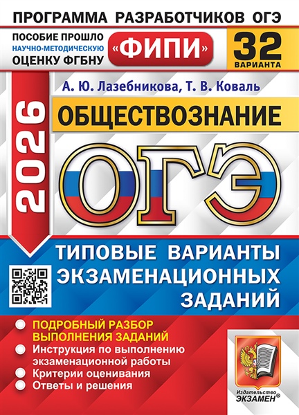 Лазебникова А.Ю., Коваль Т.В. ОГЭ ФИПИ 2026. 32 ТВЭЗ. ОБЩЕСТВОЗНАНИЕ. 32 ВАРИАНТА. ТИПОВЫЕ ВАРИАНТЫ ЭКЗАМЕНАЦИОННЫХ ЗАДАНИЙ