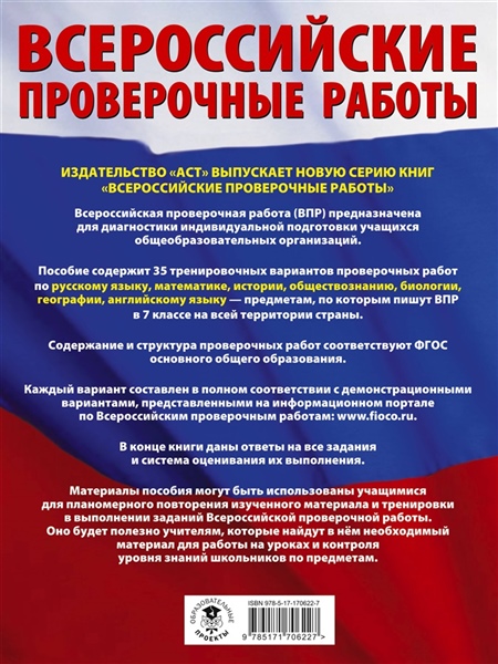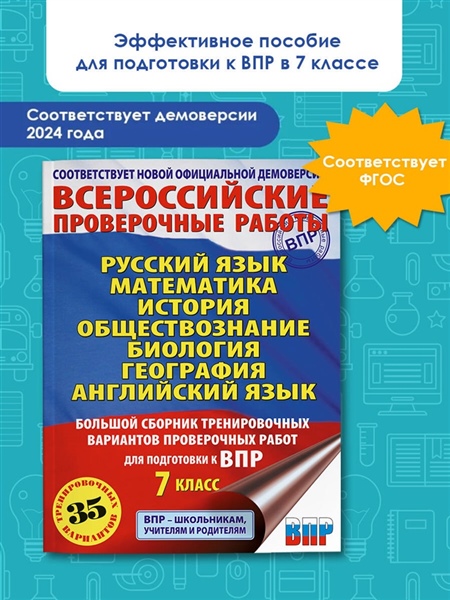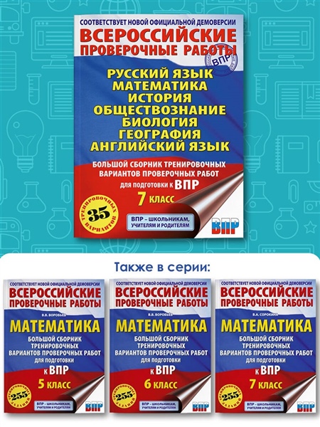 Данное пособие предназначено для учащихся 7-х классов общеобразовательных организаций. Оно позволяет в кратчайшие сроки проверить свои знания, потренироваться в выполнении заданий и тем самым успешно подготовиться к выполнению Всероссийских проверочных работы по итогам обучения в течение года.Пособие содержит 39 тренировочных вариантов проверочных работ по РУССКОМУ ЯЗЫКУ, МАТЕМАТИКЕ, ИСТОРИИ, ОБЩЕСТВОЗНАНИЮ, ФИЗИКЕ, БИОЛОГИИ, ГЕОГРАФИИ И АНГЛИЙСКОМУ ЯЗЫКУ — предметам, по которым пишут ВПР в 7 классе на всей территории страны.Содержание проверочных работ соответствует Федеральному государственному образовательному стандарту основного общего образования. Каждый вариант составлен в полном соответствии с демонстрационными вариантами, представленными на информационном портале по Всероссийским проверочным работам: www.fioco.ru. В конце книги даны ответы на все задания, решения и критерии оценивания. Материалы пособия будут полезны учителям, которые найдут в нём материал для работы на уроках и контроля уровня знаний школьников по предметам.